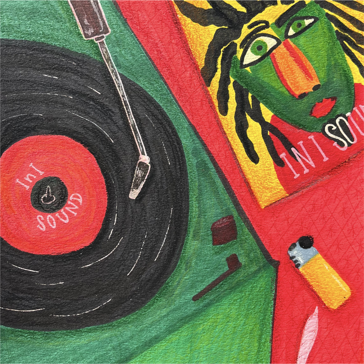 Illustration made as an homage to I’n’I Sounds, the great reggae music show from Radio Fremantle (every Saturday from 7 to 9 PM). If you’re looking at this t-shirt, you might like reggae, so please… go listen to that show!